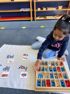 At the Montessori School of Silicon Valley, we use a phonetic approach to writing and reading.   Phonics is a method of teaching reading and writing by developing the ability to hear and identify sounds of the English language.