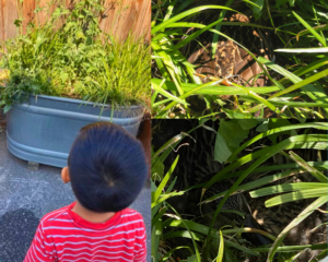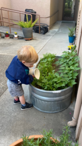 Oliver works hard almost every day to make sure the plants are watered. We offer him various pitchers and watering cans but he likes to pick the biggest one, big watering cans mean they carry big and heavy amounts of water. When carrying the pitcher, Oliver is very wobbly, sloshes the water around causing spills, but tries very hard to keep it all in…and the small amount that’s left (sometimes it’s a tiny stream), he’s super proud he can bring it to the plant. He’ll do that several times until satisfied.