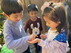 Freddie is a 3rd year student (kinder) and Emma is 4. Like most big brothers, he protects and helps his little sister. Well, in this case, the roles were reversed. Freddie, not a fan of “bugs” was reluctant to interact with the ladybugs released into the garden.