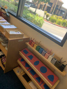 Beautifully crafted and begging to be touched, Montessori’s distinctive learning materials are displayed on open, easily accessible shelves. They are arranged (left to right, as we read in Western languages) in order of their sequence in the curriculum, from the simplest to the most complex.