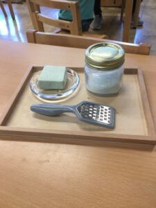 All morning, the “soap grating” activity had been in use. The jar of grated soap was filling up. Every time the soap grating activity was returned to the shelf, someone quickly took it out.