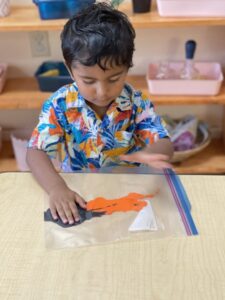 This is the perfect time to encourage language skills and acquisition. It lays the foundation for reading. The MSOSV Primary language program picks right up where the PP classroom leaves off, with most of the Montessori children at MSOSV reading by age four and enabling our 3rd Year’s (Kinders) to begin writing their own stories.