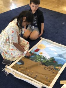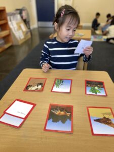 As the kindergarteners’ progress through the school year, they will begin to label the Backyard Biome Mat with grammar cards and build sentences. Using the Cosmic Nest Boxes the students can better understand their place in the universe.