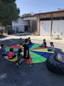 During the twice per week PE class, the kindergarten students learn new activities. As they are approaching the 2nd plane of development, the students begin to organize games with rules and outcomes. They learn to take turns, to get up when they fall and to try again when practicing a new skill.