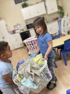 Instead of being the child’s boss and saying things like “let me do it”, or “I’ll do it for you”, focus on coaching them on how to do it. When you provide the next step verbally, you allow them to learn without you taking over. This encourages them and allows them to feel accomplished about completing a task. Sometimes a simple guide with your hand – open palm gesture – leading the way, follow with your eyes. They will follow with their eyes as well. In the Montessori Community, you will notice the guide gently helping by guiding the child. Ultimately, by remaining at their side, and assisting with “hand-over-hand” movements, the child gains the confidence to try the task themselves.