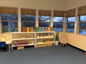 Primary Community: Multi-age classrooms are arranged to foster peer-to-peer learning, independence, and a sense of belonging. Bright windows provide natural lighting, and shelves display Montessori materials inviting children to choose activities that spark their interest.