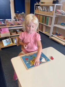 At MSOSV, Montessori shelves are organized left to right, top to bottom, with the least complex activities on the upper left and the most complex on the bottom right. This natural progression supports independent exploration.