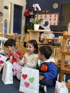 Children had created their own Valentine bags earlier in the week and on Friday participated in a Valentine exchange with their classmates. These activities encouraged creativity, fine motor skills, and kindness as children shared valentines with one another.
