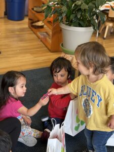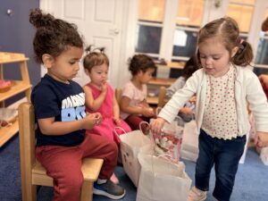 Children had created their own Valentine bags earlier in the week and on Friday participated in a Valentine exchange with their classmates. These activities encouraged creativity, fine motor skills, and kindness as children shared valentines with one another.