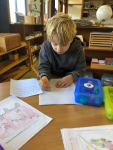 Our Kindergarteners are also writing and illustrating their own short narrative stories this spring. This is a milestone that reflects an incredible arc of language development: from the first phonetic sounds introduced in the primary years, through early reading and writing, to original storytelling with their own characters, plot, voice, and illustrations. Each story is bound into a book. One copy stays at
